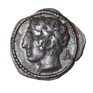 Macedon Olynthos 432-348 BC Silver Tetrobol Laureate bust of Apollo / Kithara in square 16mm, 2.30g This coin comes from the Cambridge collection of Ancient Greek Coinage. This extensive collection was formed over 40 years by a couple who shared their passion for classical history, carefully collecting as many known types as were available, […]