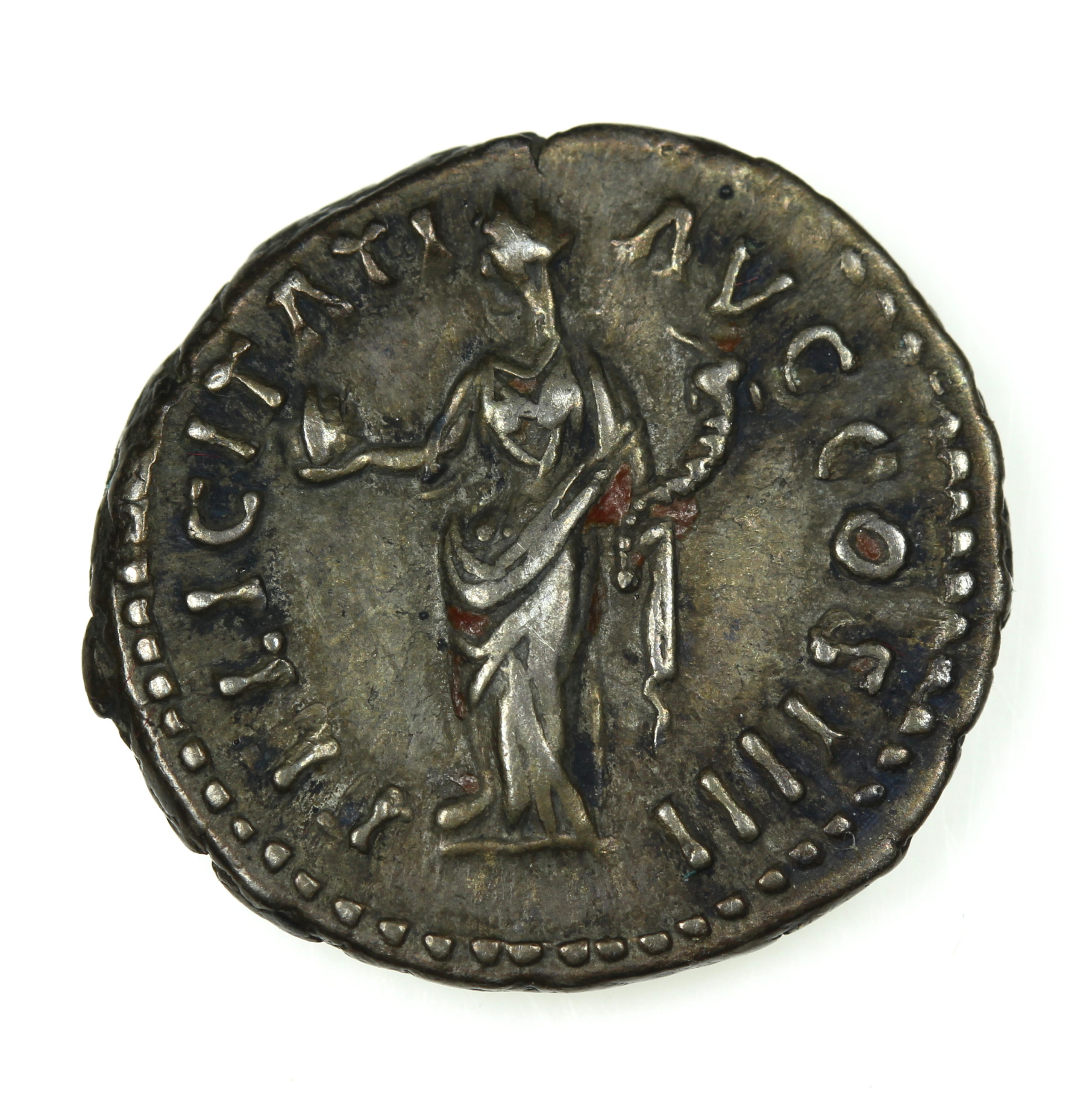 Laureate bust right/Felicitas holding globe and cornucopiae
