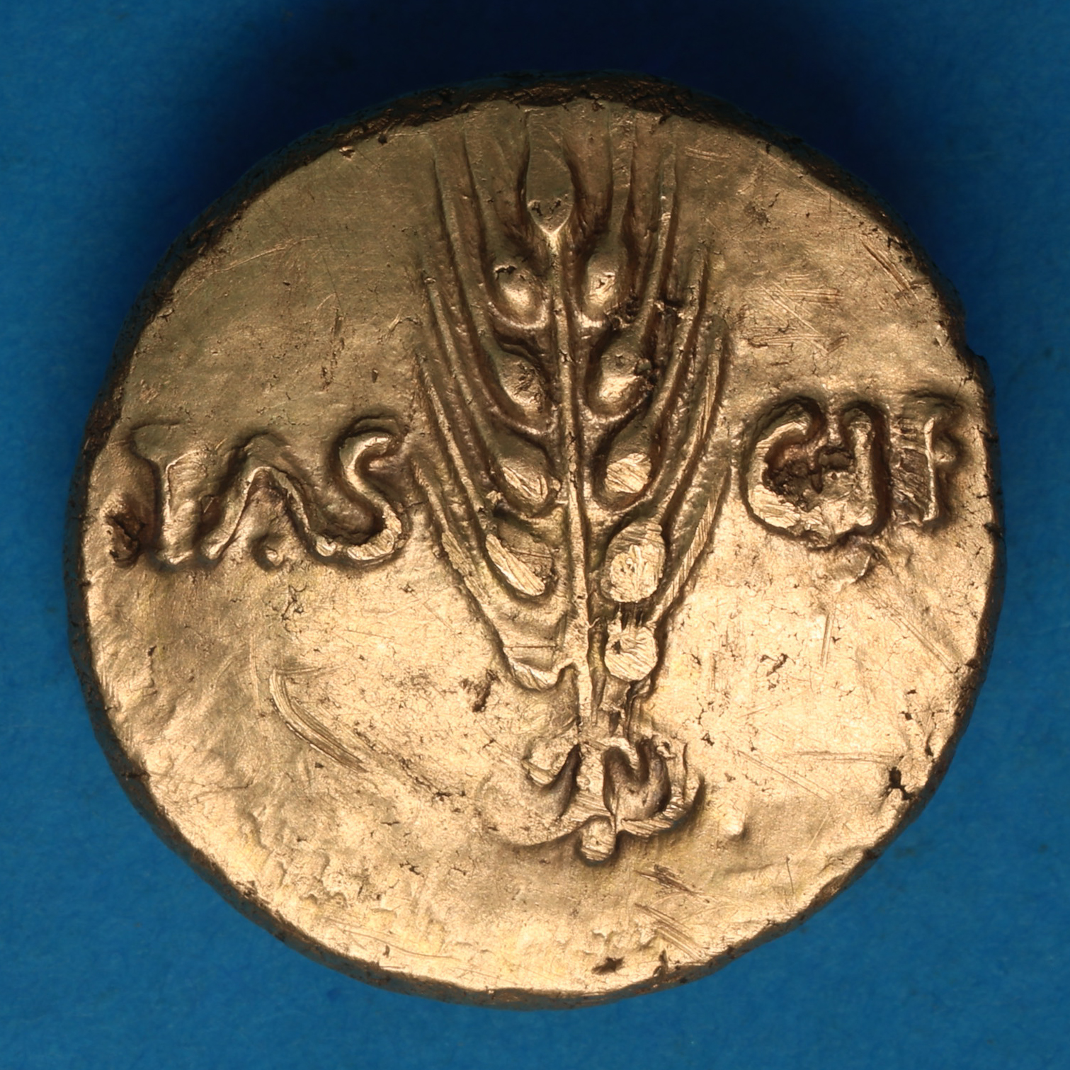 Corn ear, TAS to left, CIF to right / Warrior on horse right holding spear and shield, EPATI below, CCV above