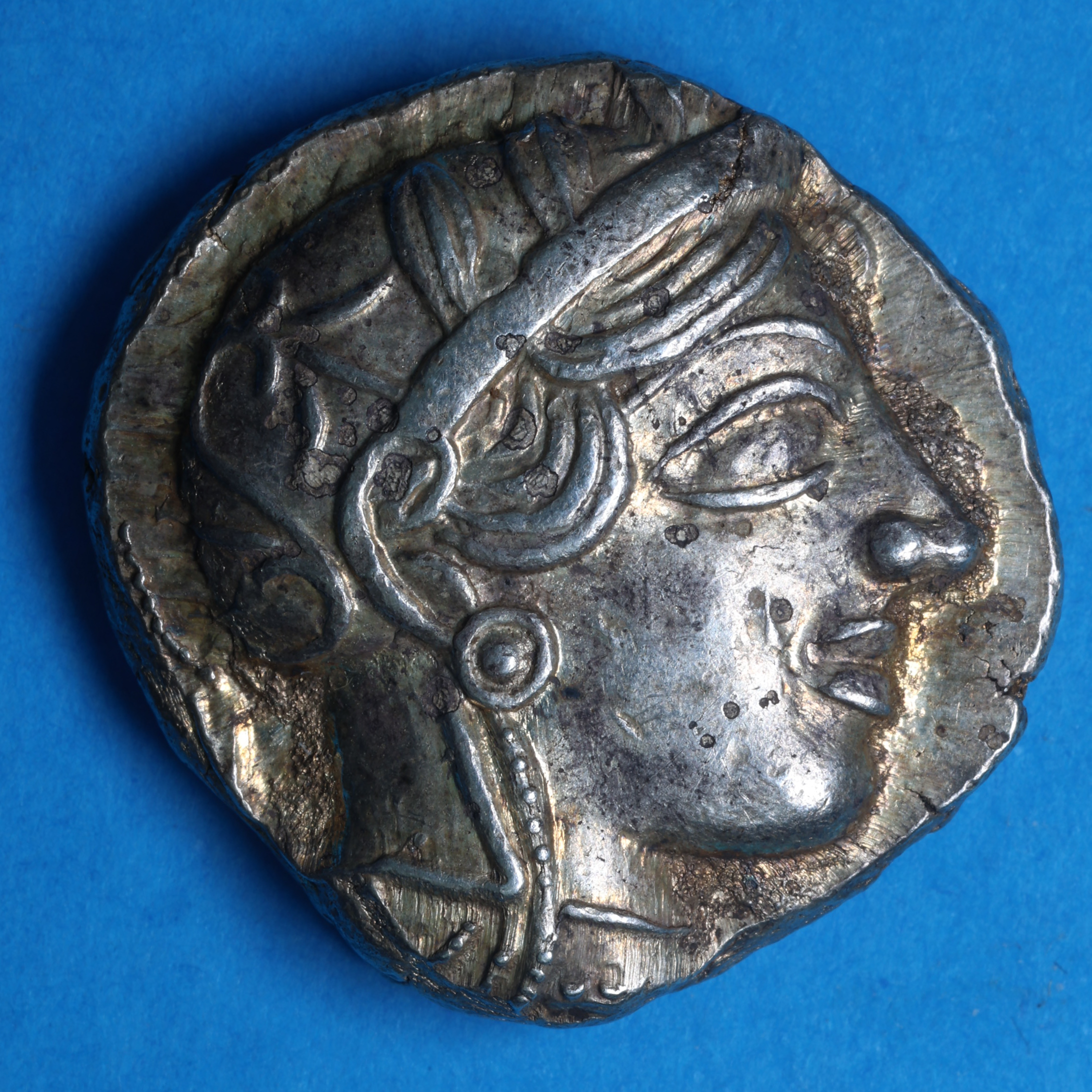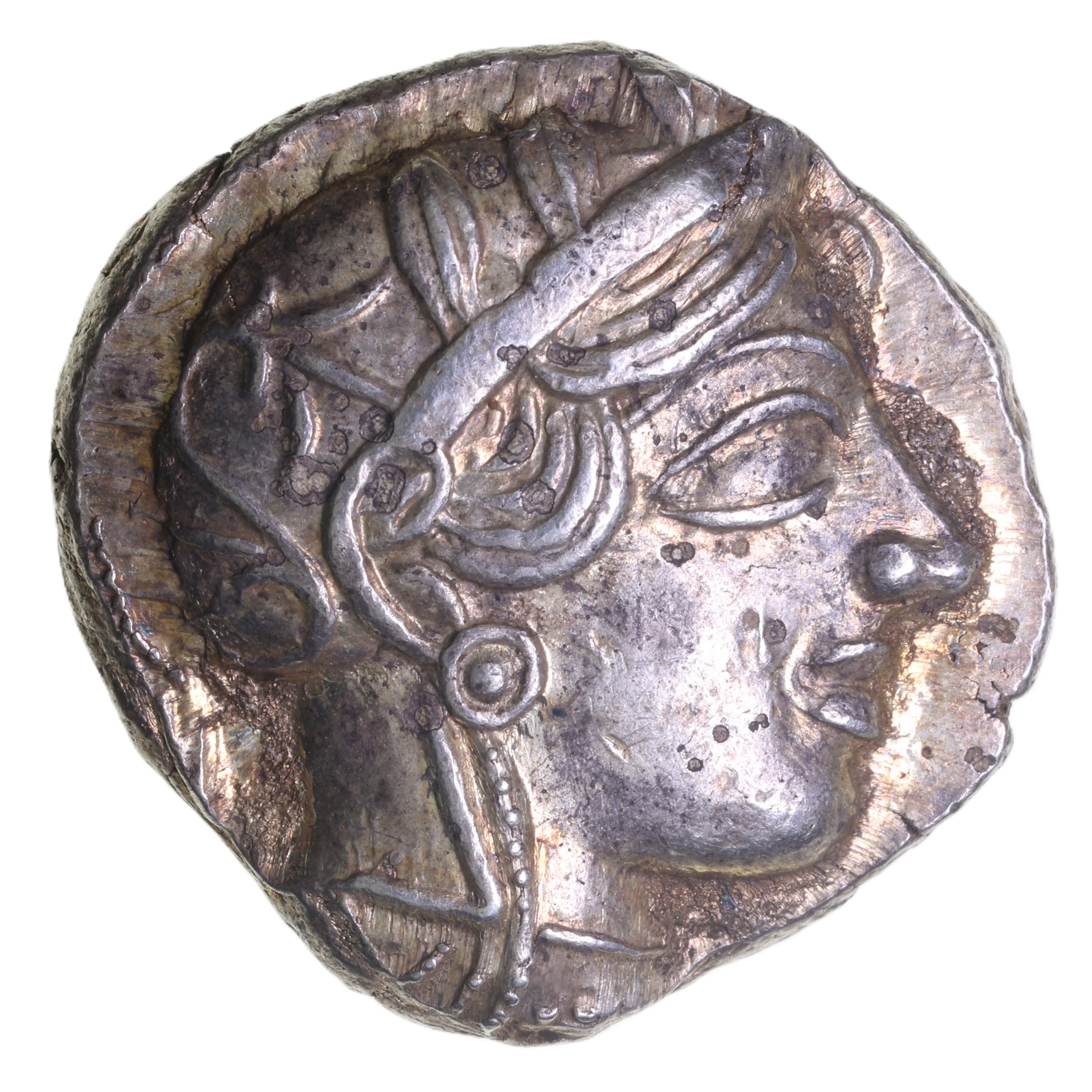 Obverse description: Head of Athena (goddess of wisdom) right, wearing earring, necklace and crested Attic helmet decorated with olive leaves.