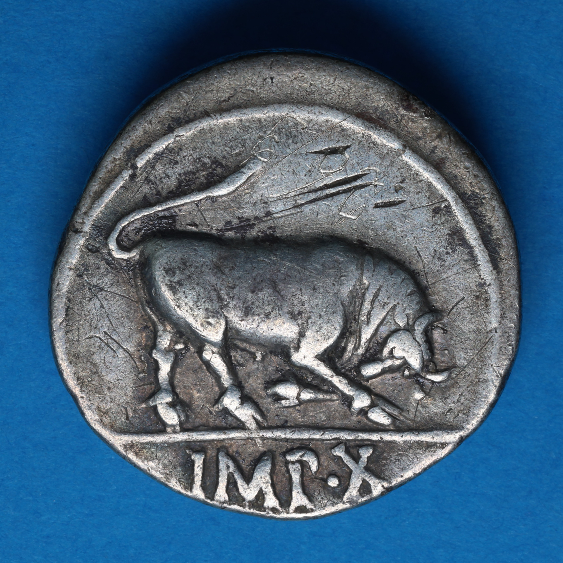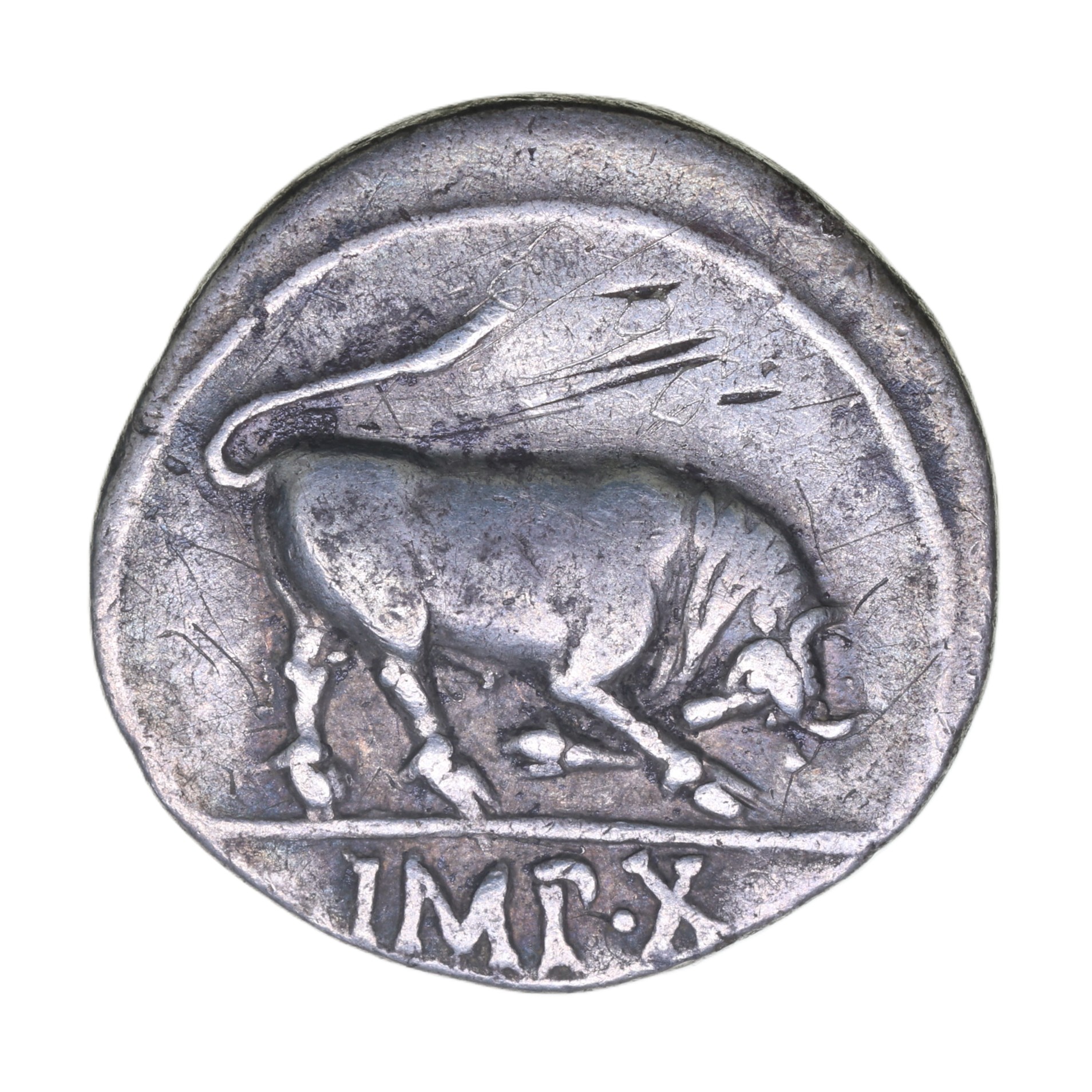 Laureate bust right /Bull butting right, IMP X