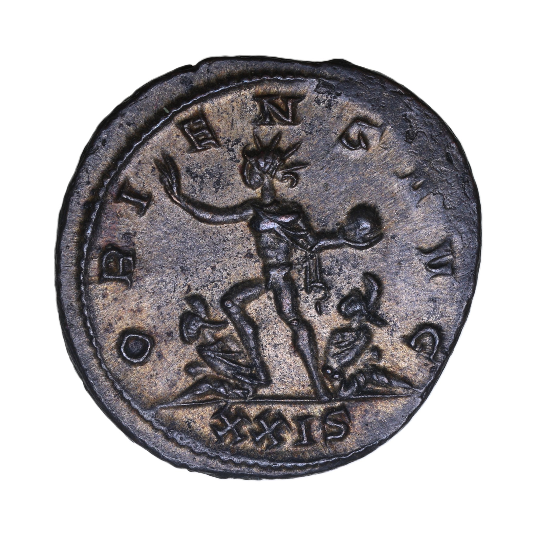 Radiate bust right/Sol advancing between 2 captives