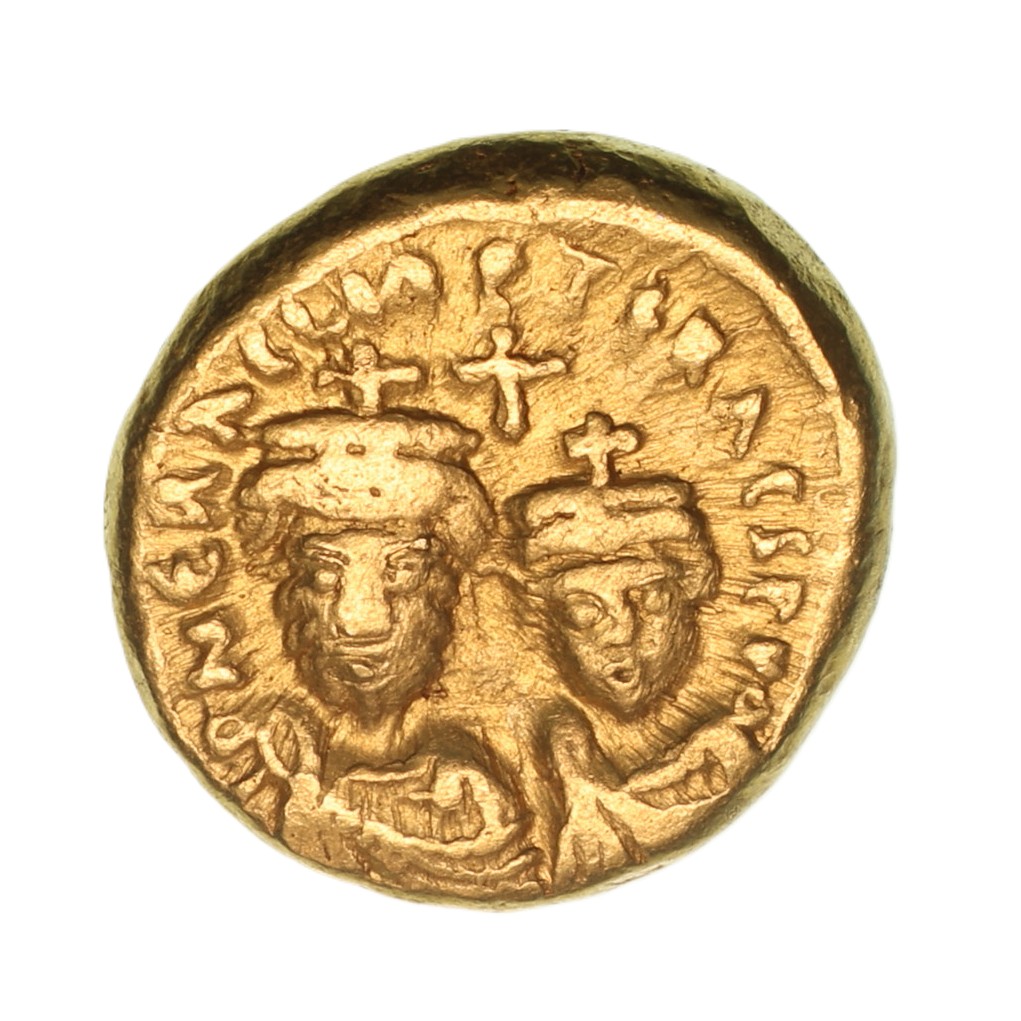 The sons of Heraclius, Heraclius Constantine and Heraclonas, were made associate emperors in AD 613 and AD 638 respectively. This aureus depicts the 3 emperors and was minted shortly before Heraclius died in AD 641.