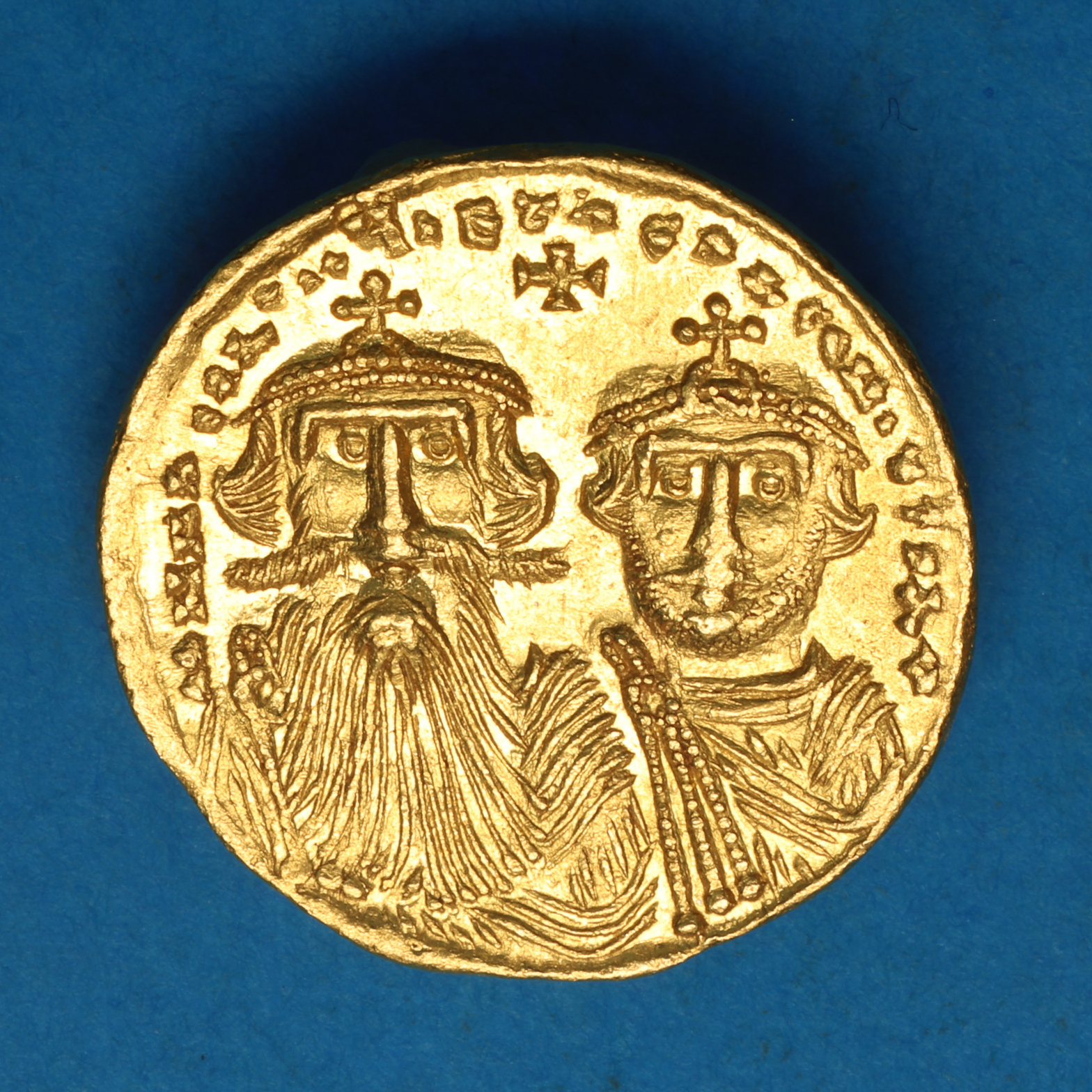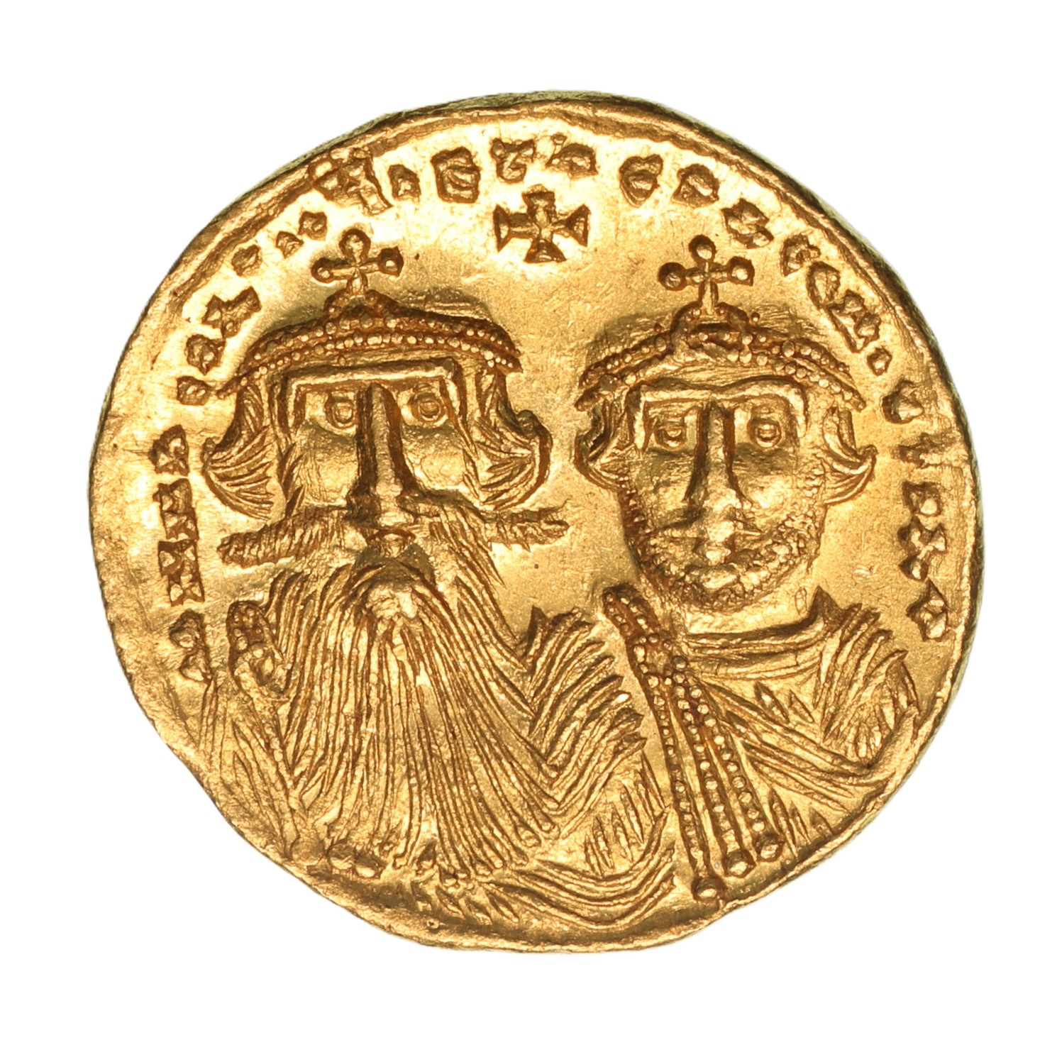 The sons of Heraclius, Heraclius Constantine and Heraclonas, were made associate emperors in AD 613 and AD 638 respectively. This aureus depicts the 3 emperors and was minted shortly before Heraclius died in AD 641.