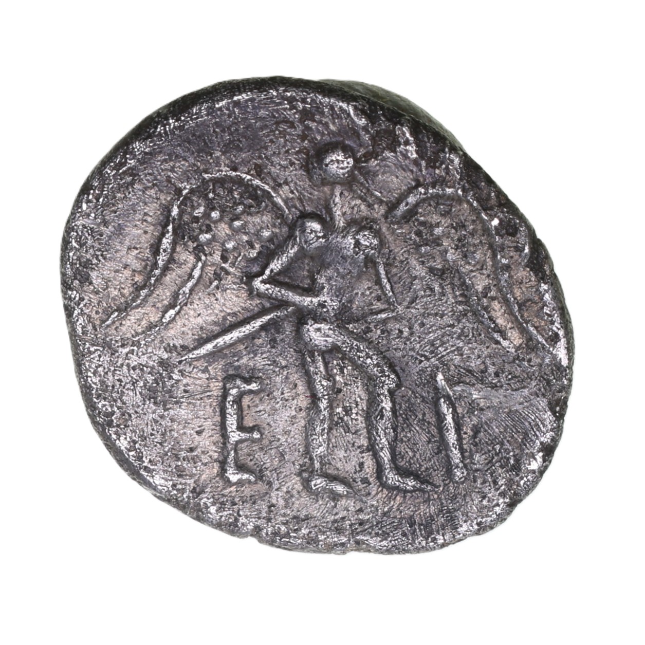 Bearded head left wearing diadem/ Winged Victory walking right, E to left, P to right