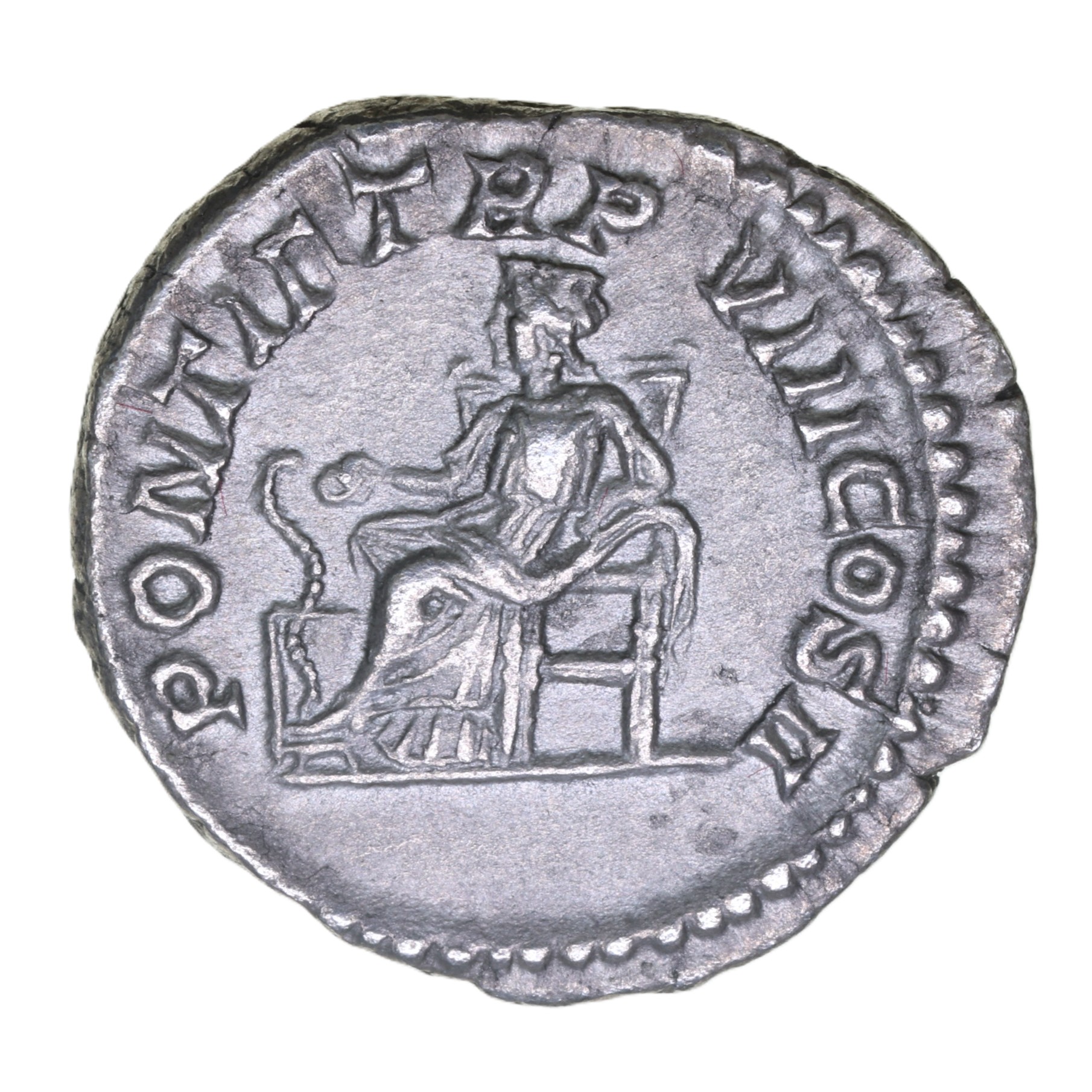 Laureate bust right/ Salus enthroned feeding snake rising from altar