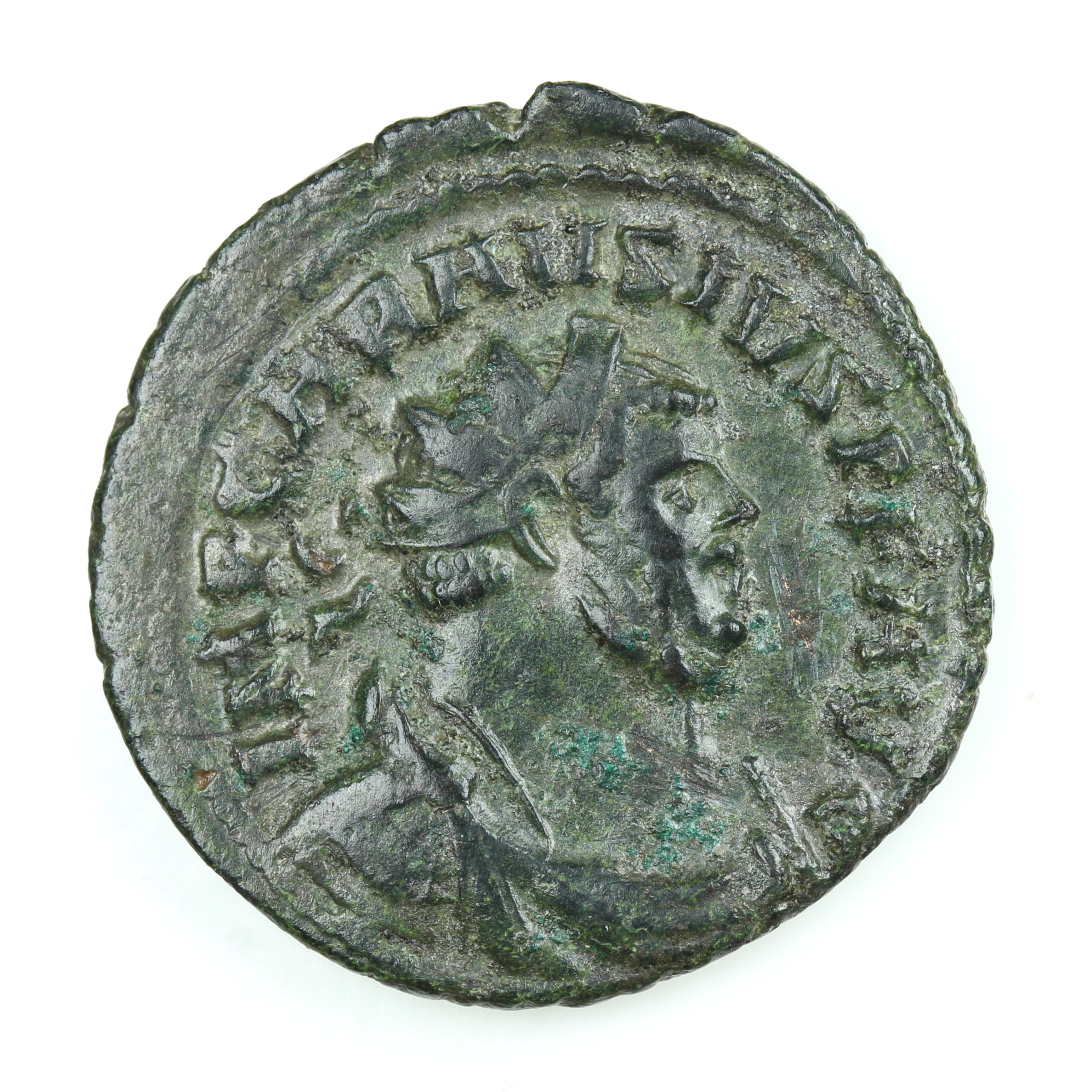 Carausius. Romano-British Emperor, AD 286-293. Antoninianus (23.5mm, 4.17 g, 7h). Uncertain mint. IMP CARAVSIVS P F AVG, radiate and draped bust right / FORTVN […] RDVX, Fortuna seated left on wheel, holding rudder and cornucopia. RIC V 794 var. (rev. legend). Dark green patina, cleaning/smoothing scratches. VF. Very rare.