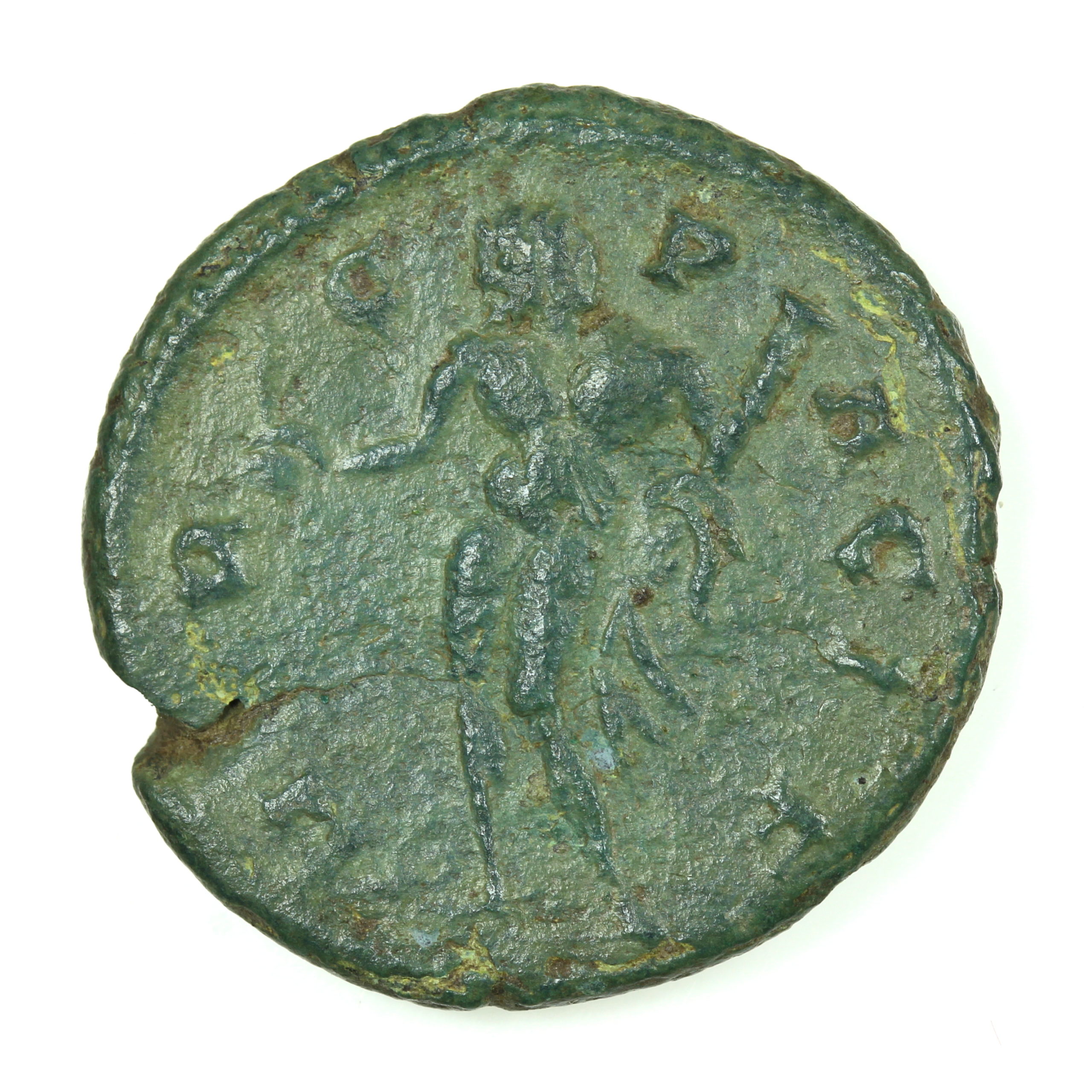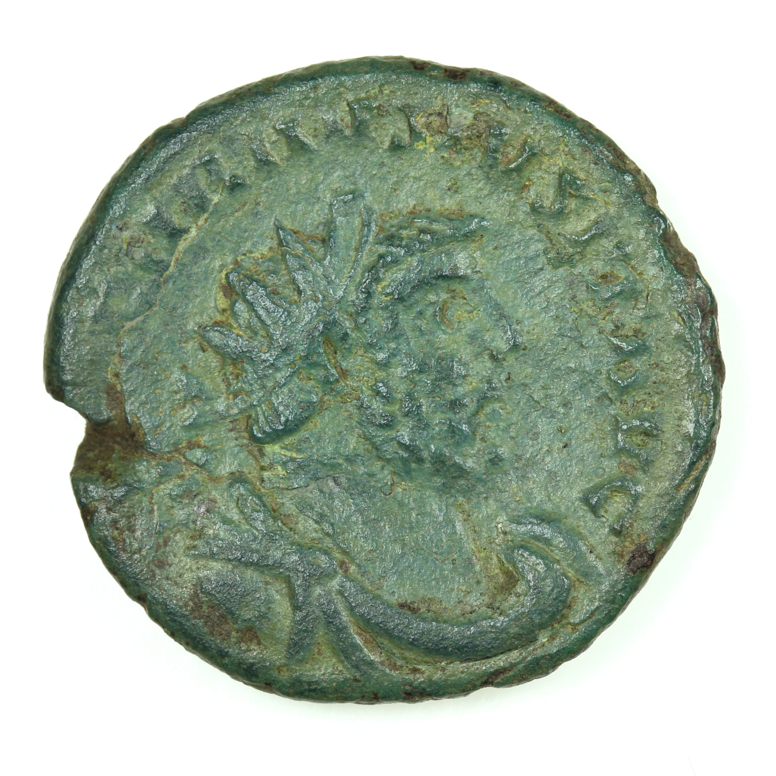 Carausius. Romano-British Emperor, AD 286-293. Antoninianus (20.5mm, 3.70 g, 6h). Uncertain mint. Radiate and draped bust right / HRC PACIF, Hercules standing left, holding uncertain object and club and lion’s skin. Cf. RIC V 802 (for similar type). Pale green patina. VF. Extremely rare and unpublished. None in CoinArchives.