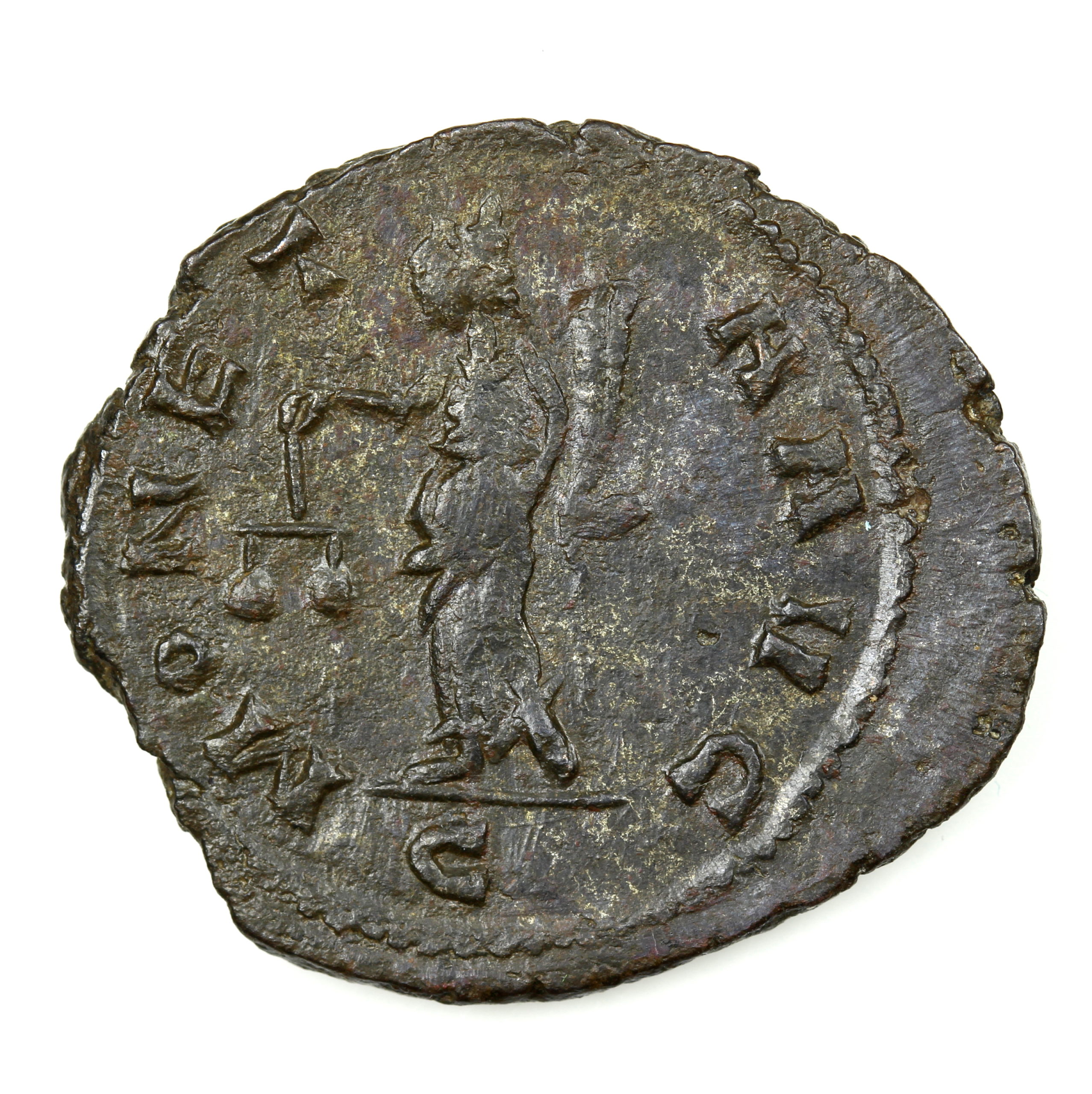 Radiate bust right/ Moneta standing holding scales. C XXI in ext