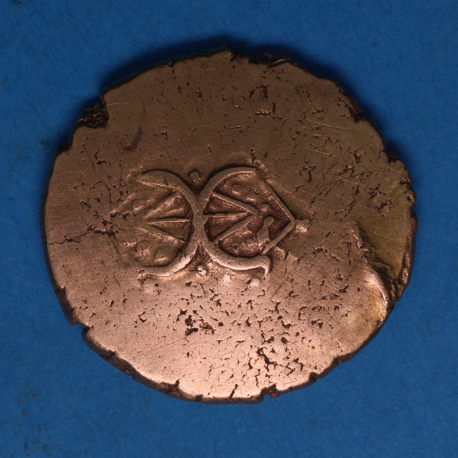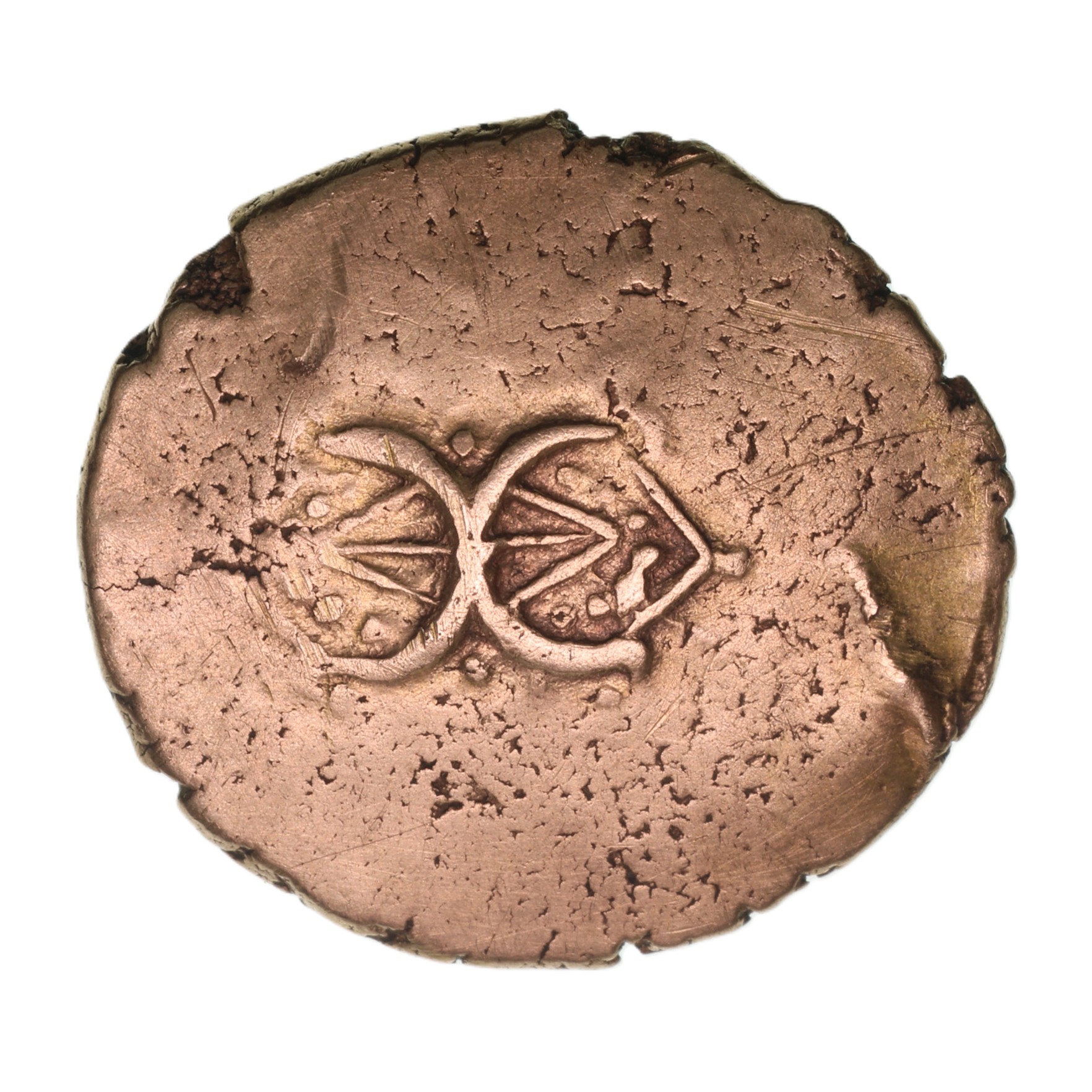Back to back crescents on plain field with pellets and lines within/Small horse right, spiral sun above and branch below. ADDEDOMAROS around