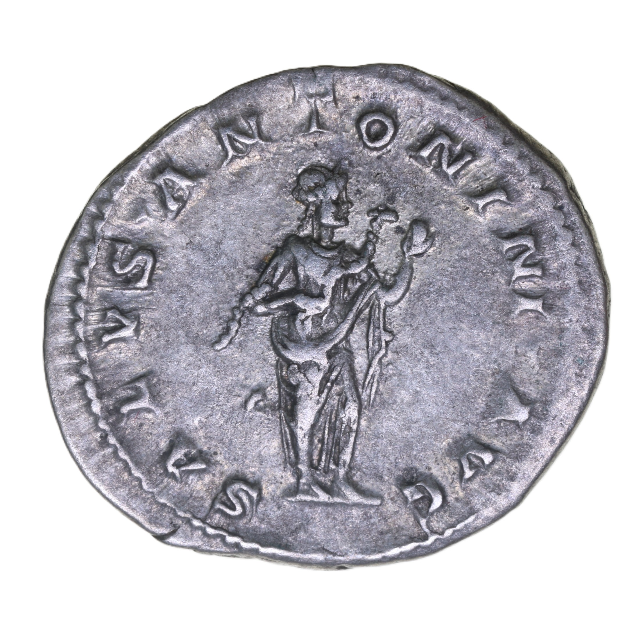 Laureate bust right/ Salus standing, feeding snake held in arms