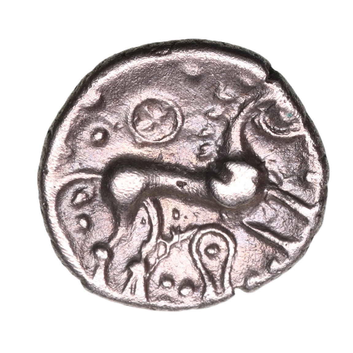 Stylised boar right with single front leg, spear piercing ear, pellets above and below / Horse prancing right, wheel with pellet triads above, phallic motif and pellet triads below