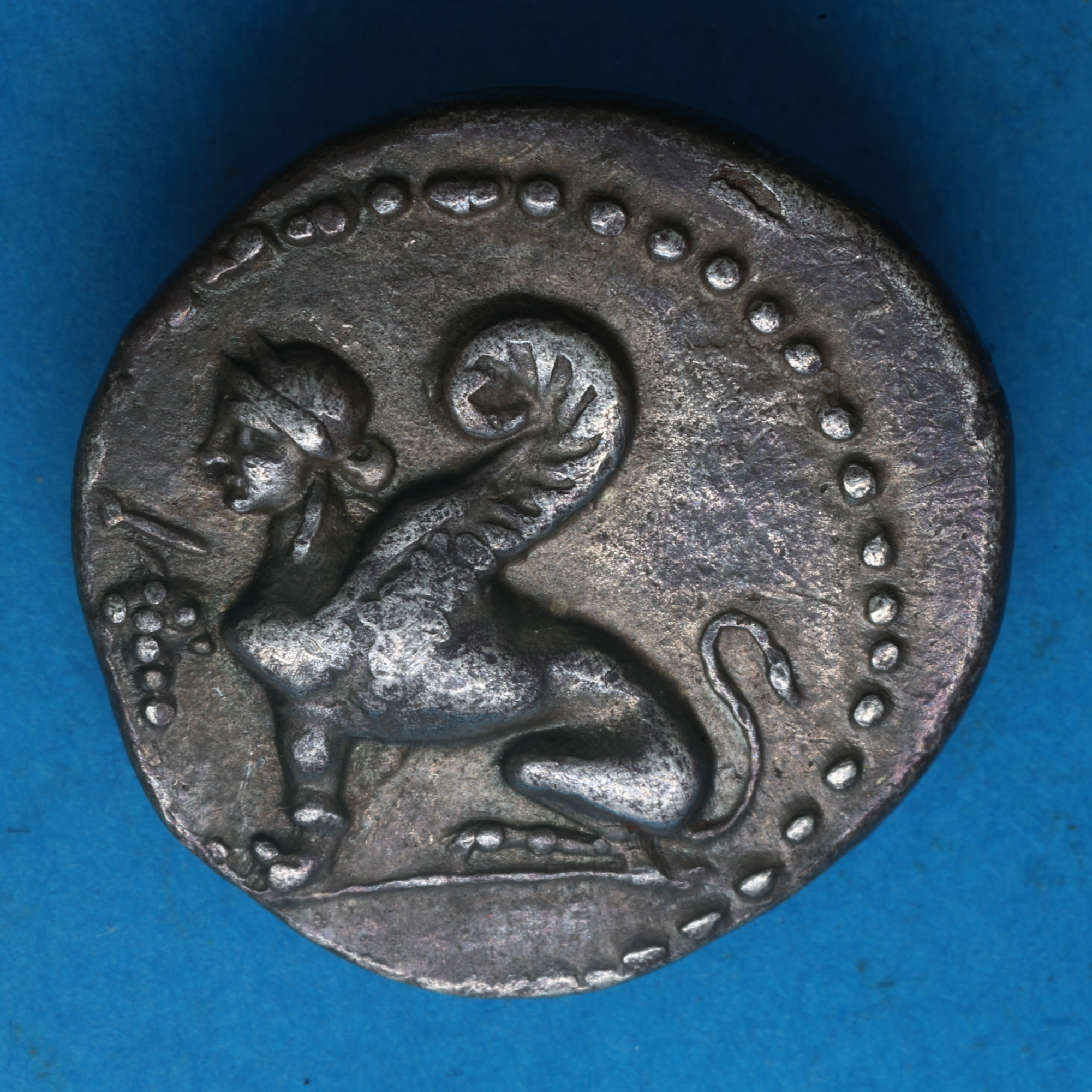 Sphinx seated left / Amphora, caduceus to left