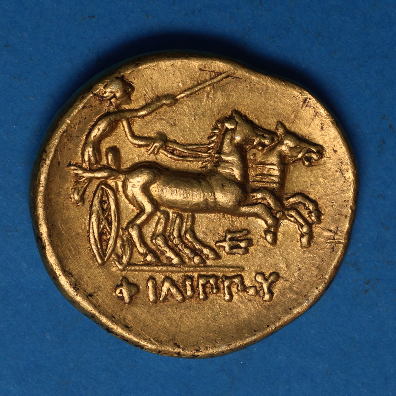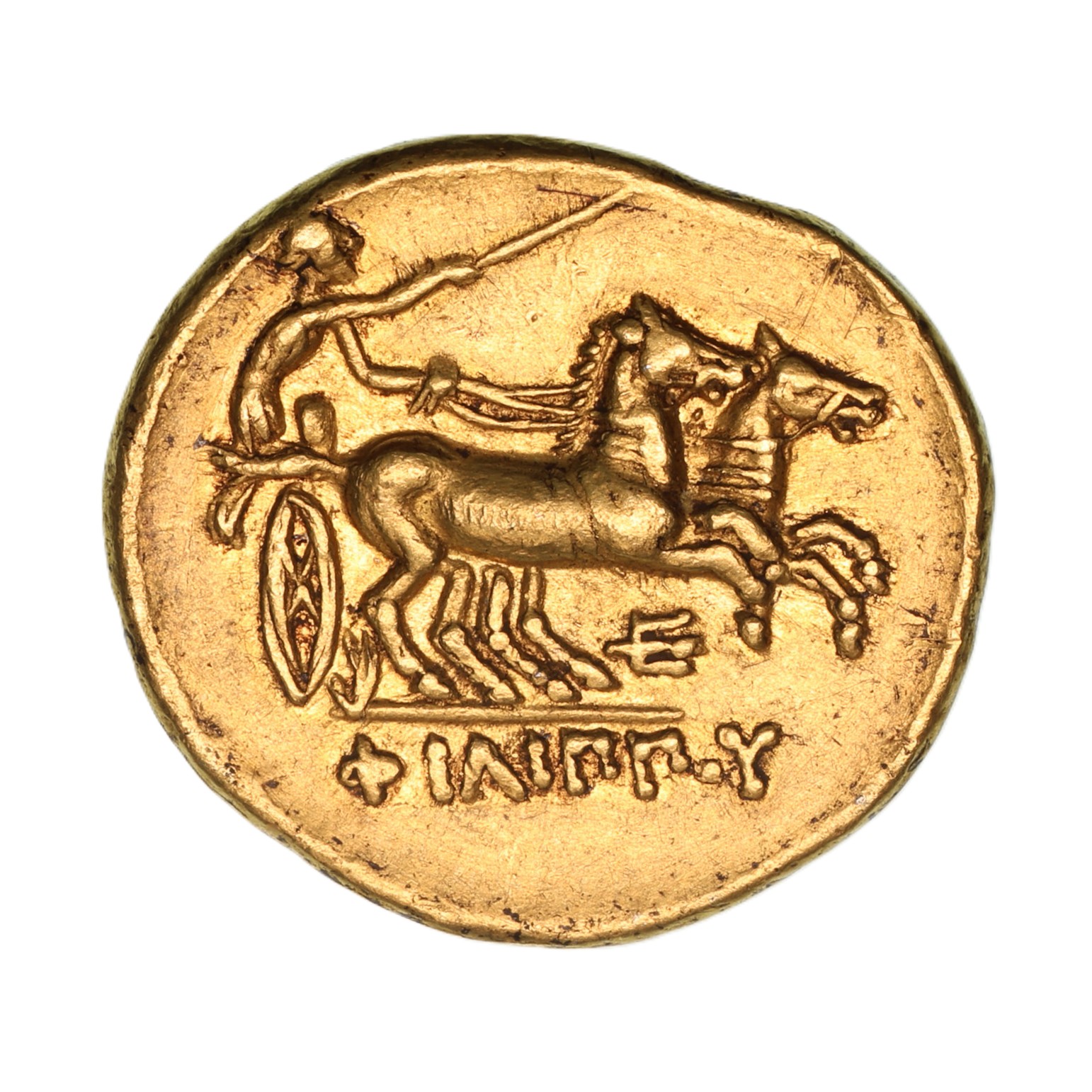 Reverse – ΦIΛIΠΠOY, charioteer, holding reins, driving fast biga right, trident below.