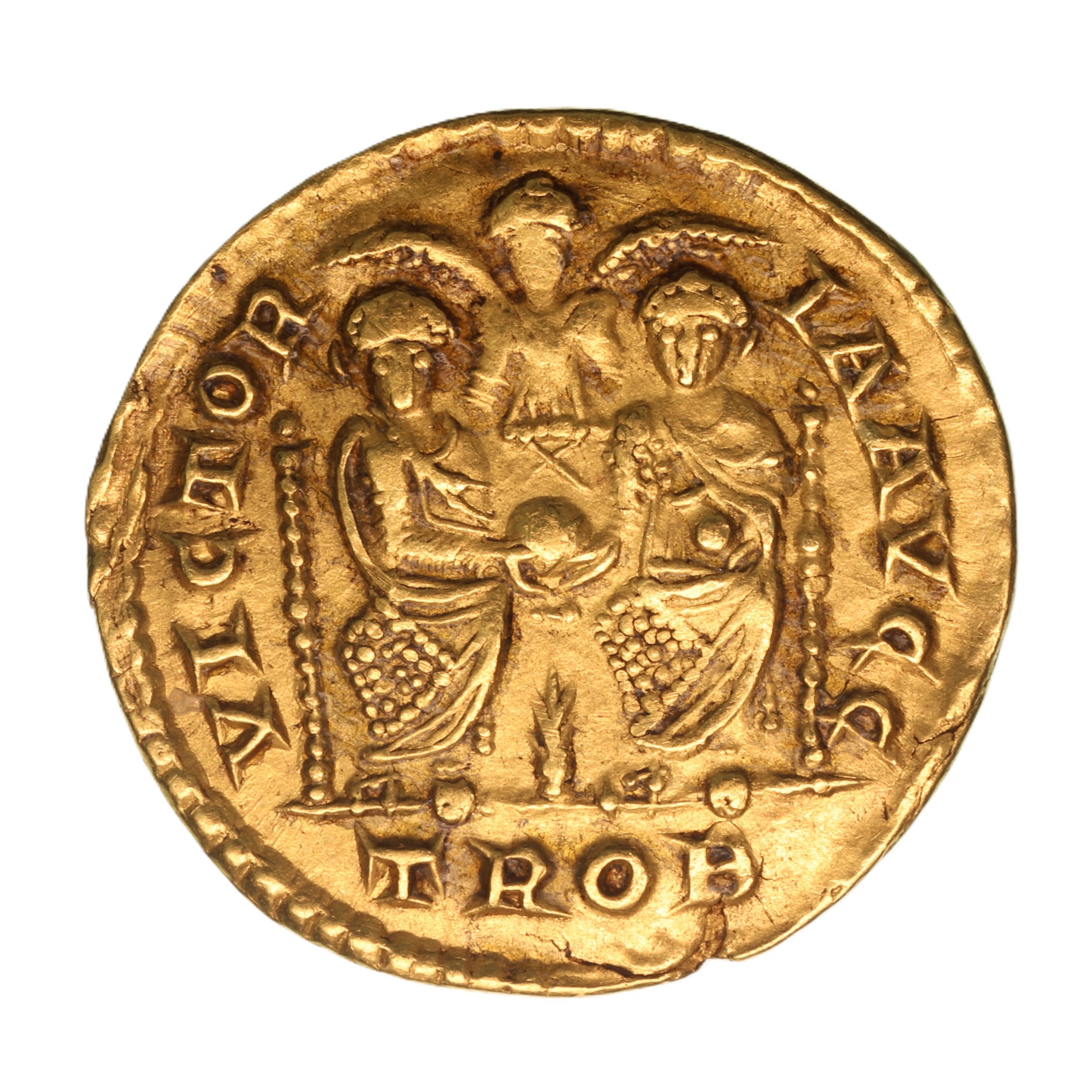 Struck AD 385-386. D N MAG MA XIMVS P F AVG, rosette-diademed, draped, and cuirassed bust right / VICTOR IA AVGG, Theodosius I and Valentinian II enthroned facing, holding a globe between them; Victory above throne, with wings spread; palm frond between legs; TROB in exergue.
