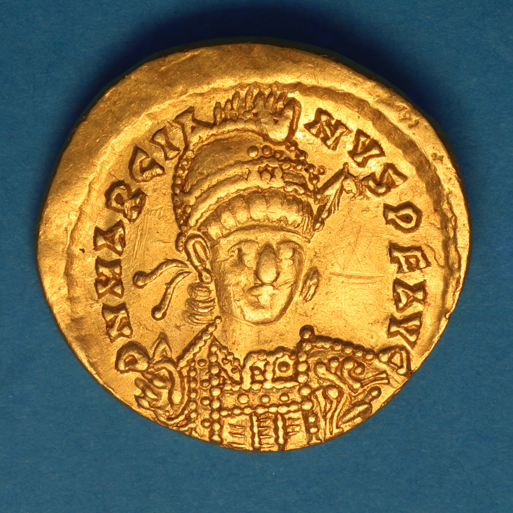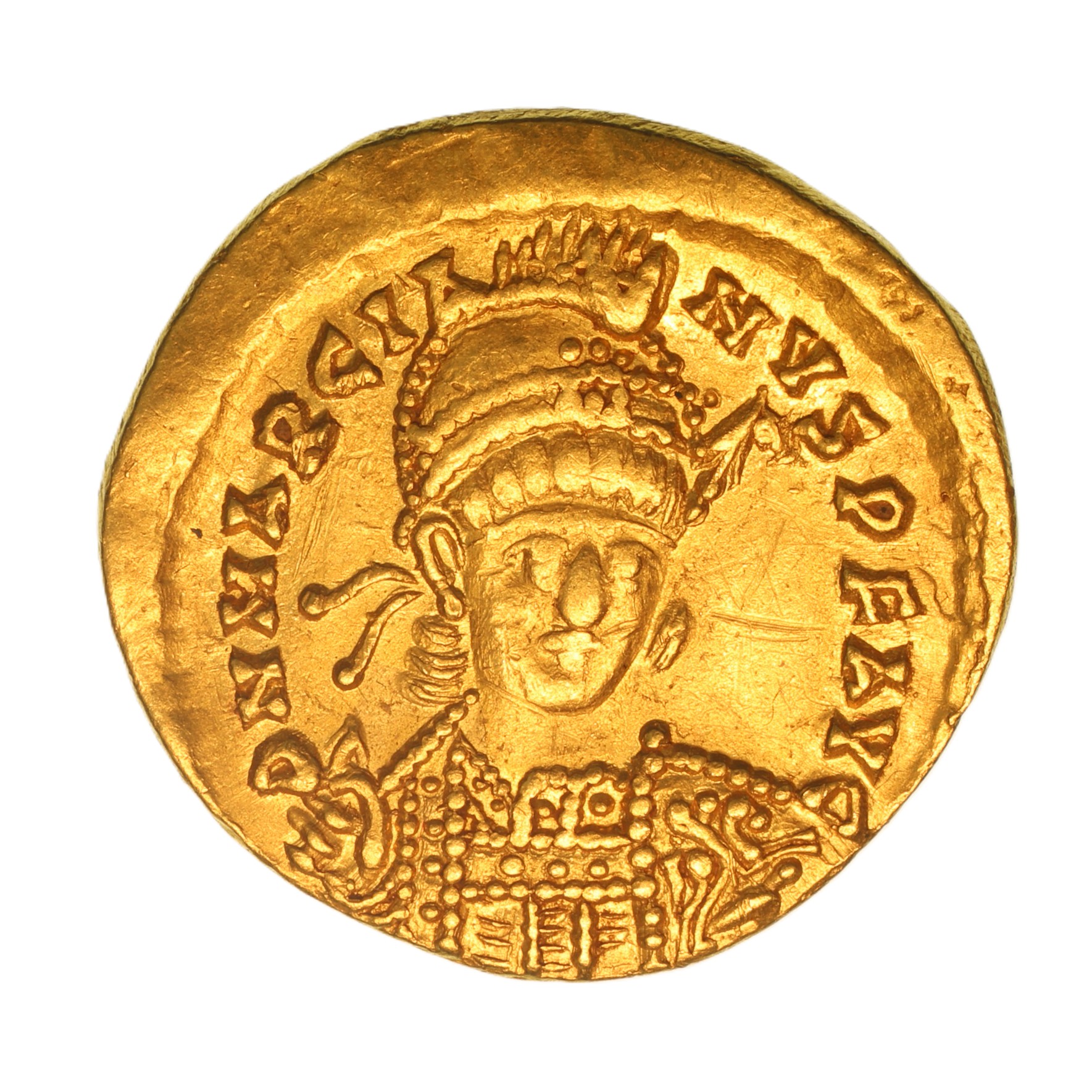 When Theodosius II died suddenly in AD 450 Marcian was chosen to be emperor. The western emperor, Valentinian III, had not been consulted and as a result refused to issue any coins in Marcian’s name. Until the death of Valentinian III in AD 455 all Marcian’s coinage was struck in the eastern empire. Although Marcian’s military career was not distinguished he had served in the imperial bodyguard and was highly regarded. This confidence was borne out and in general the eastern empire prospered during his reign. The coinage of Marcian contains a number of unusual types the most notable exception being the marriage solidus where Christ is depicted as standing between the emperor and empress.