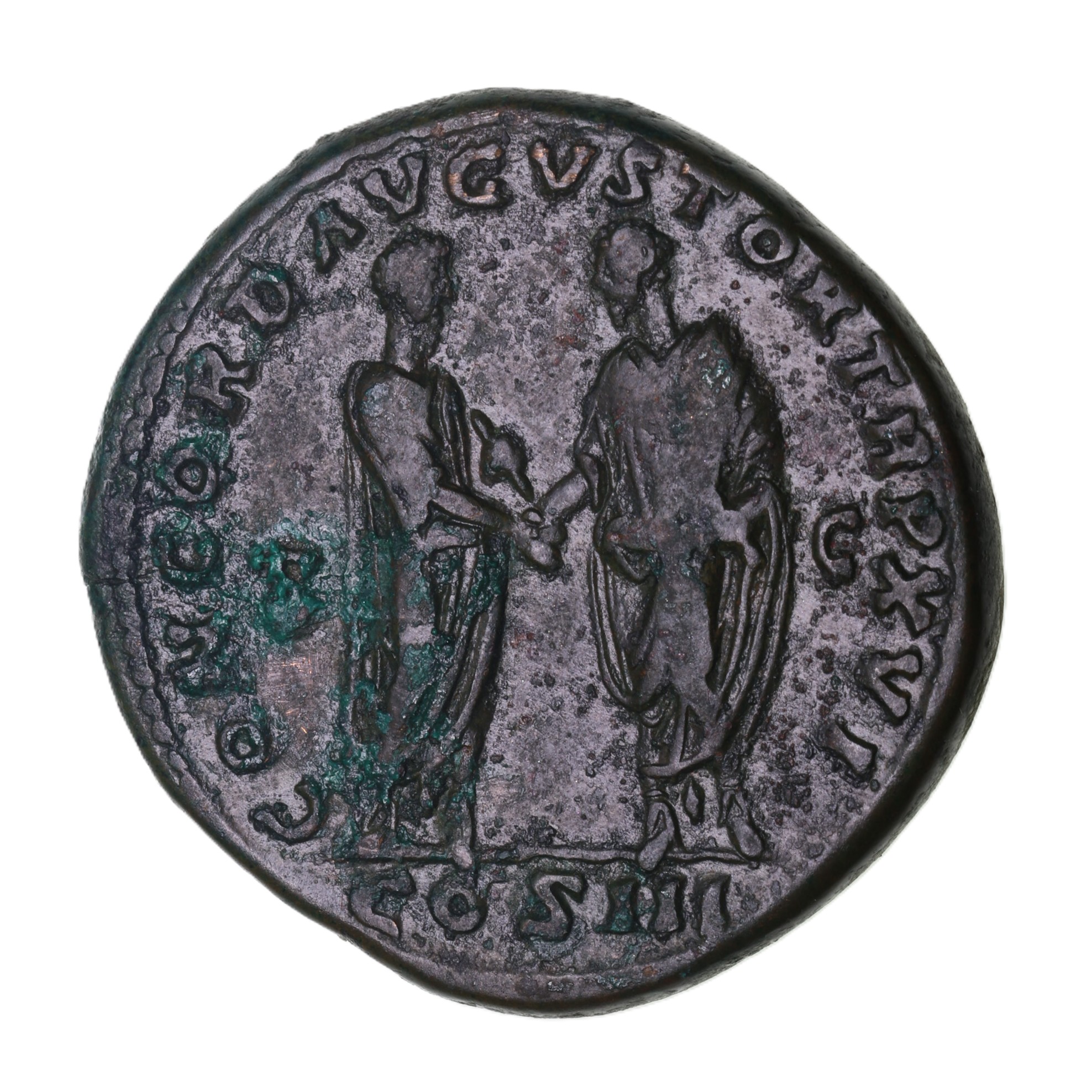 Bare headed and cuirassed bust right/Marcus Aurelius and Lucius Verus togate facing each other and clasping hands