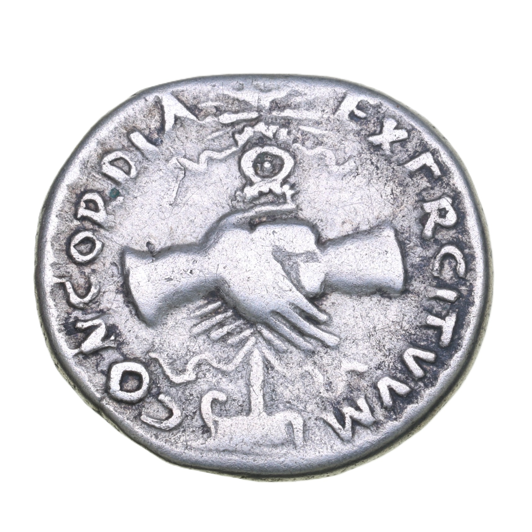 Laureate bust right / Clasped hands, legionary eagle set on prow